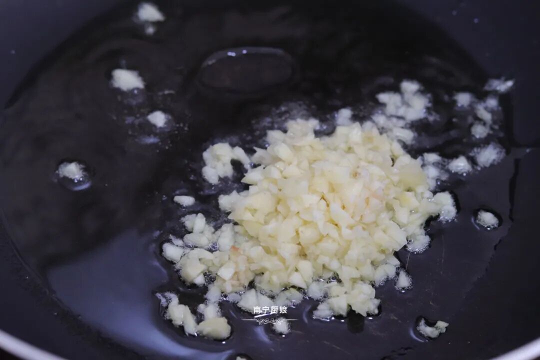 3、起锅,倒入适量的花生油,小火烧热,把蒜米倒进去爆香
