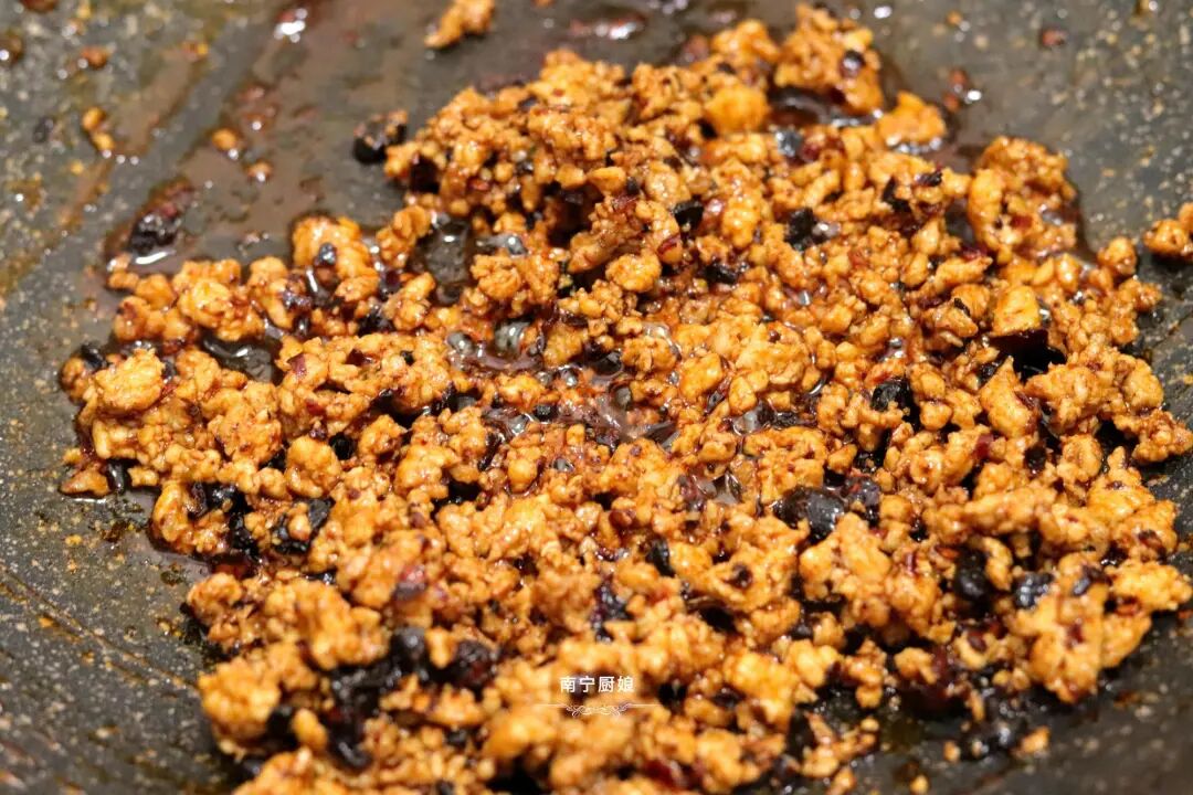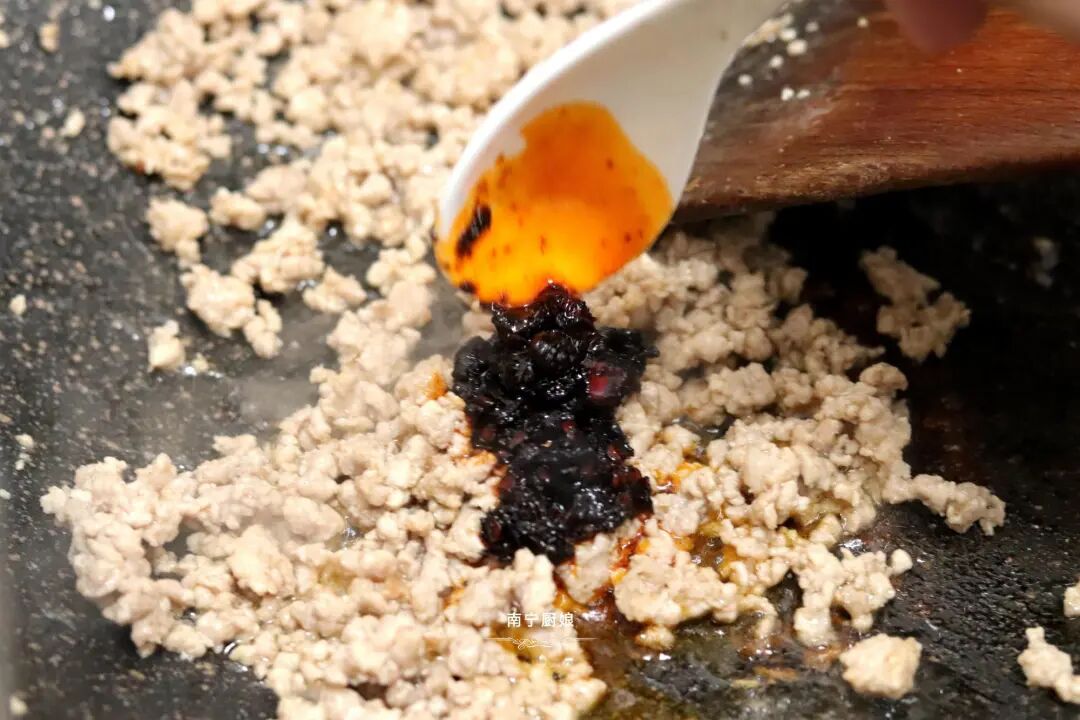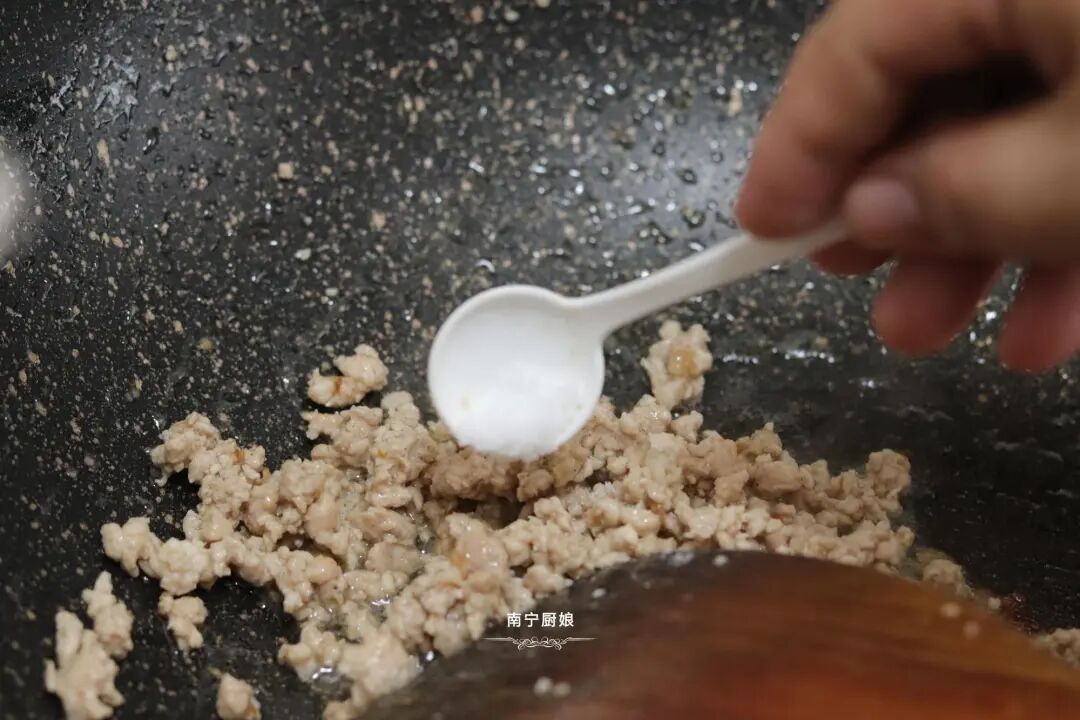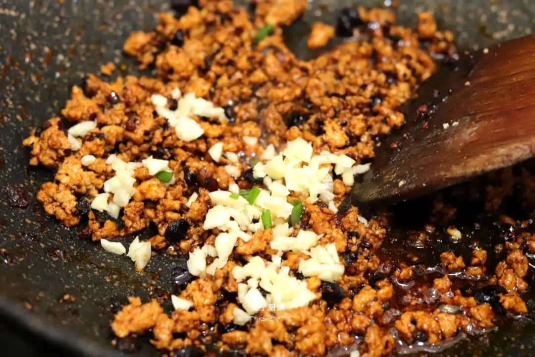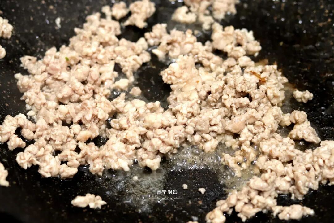 3、重新起锅,在锅里倒入适量的花生油,小火烧热后把一部分蒜米倒进去爆香后把猪肉末倒进去炒熟