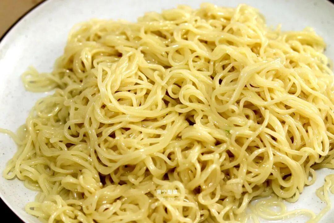 2、面条烫熟后捞出来沥干装盘,滴入几滴花生油,然后带上手套把面条抓均匀的时候都沾上花生油,好防止面条都粘在一起