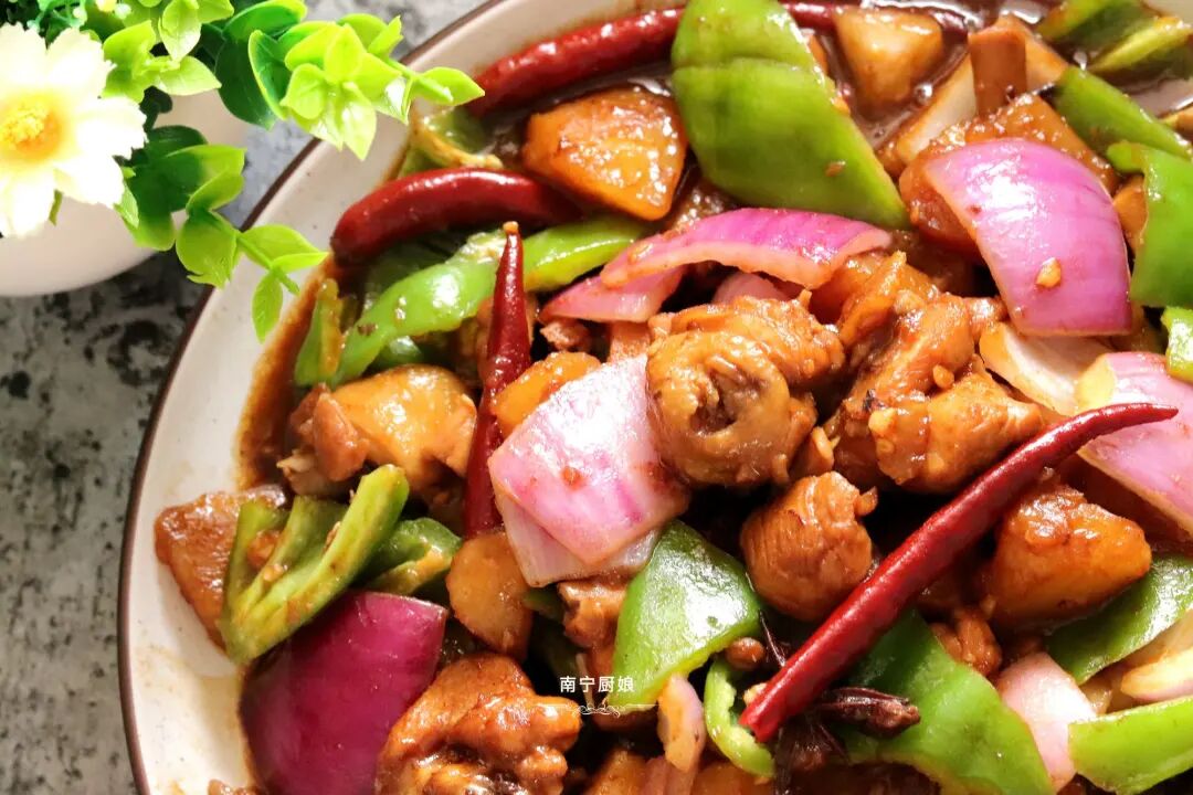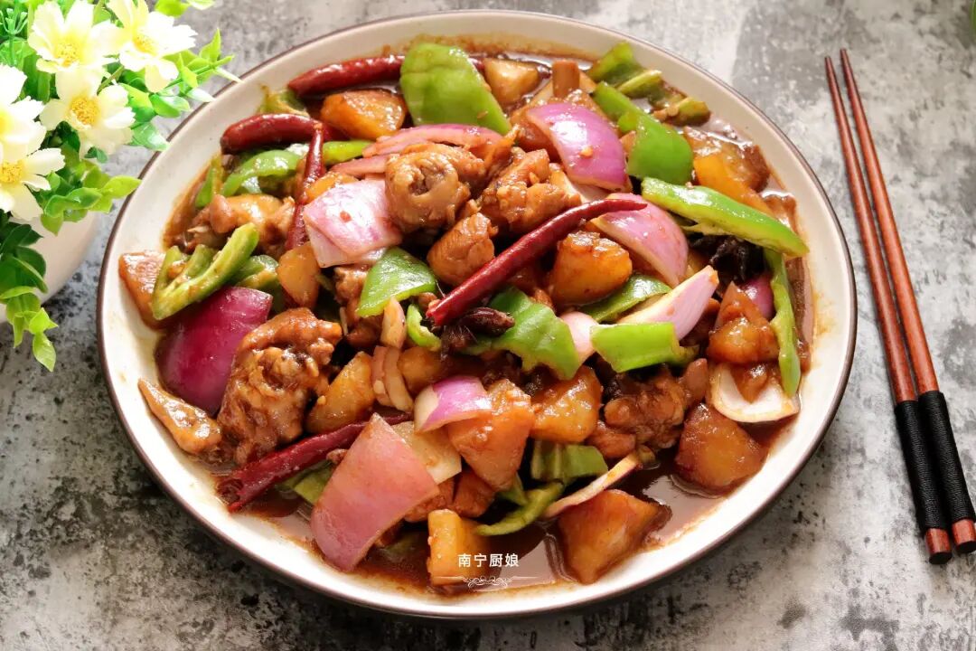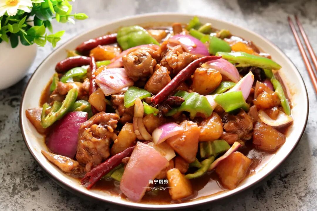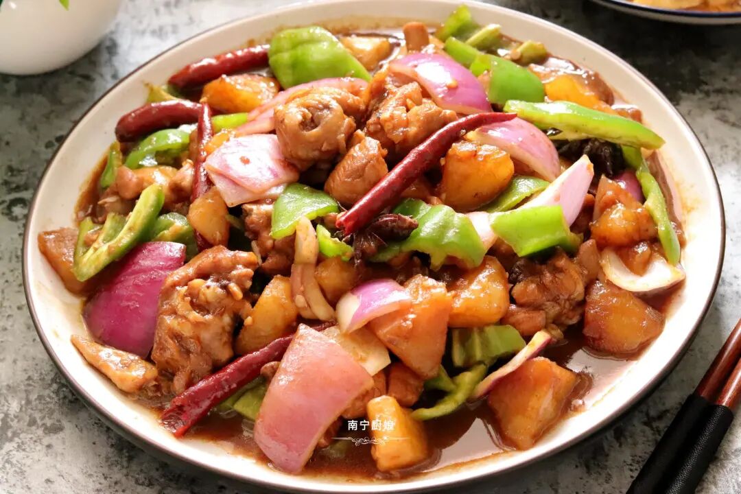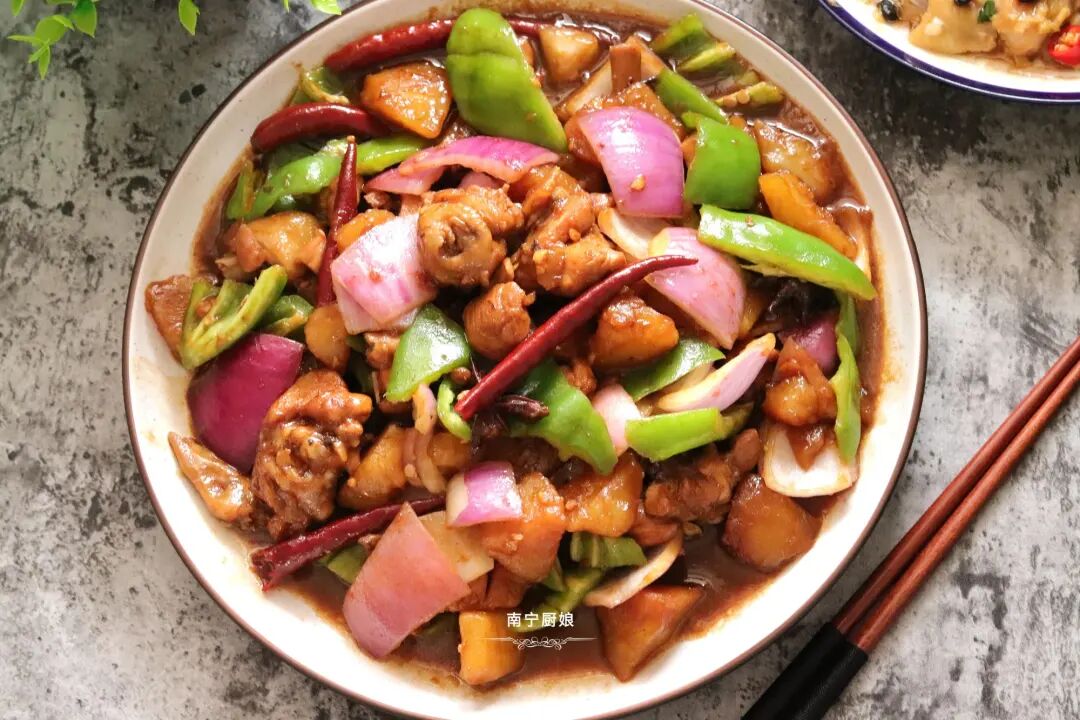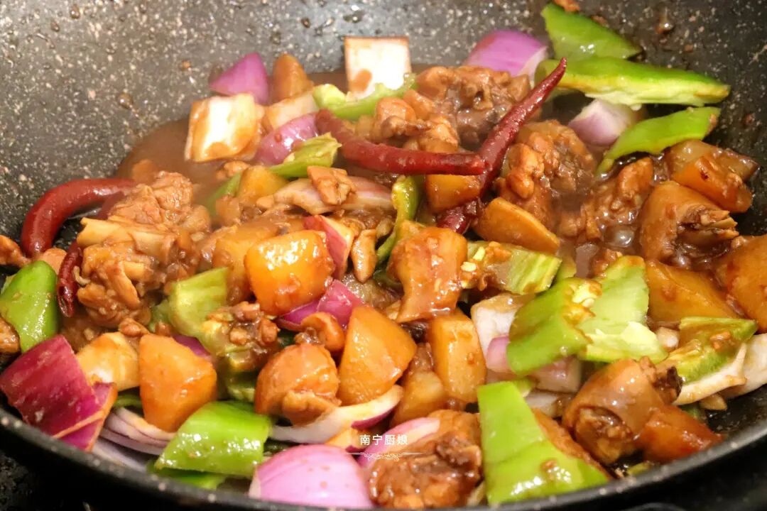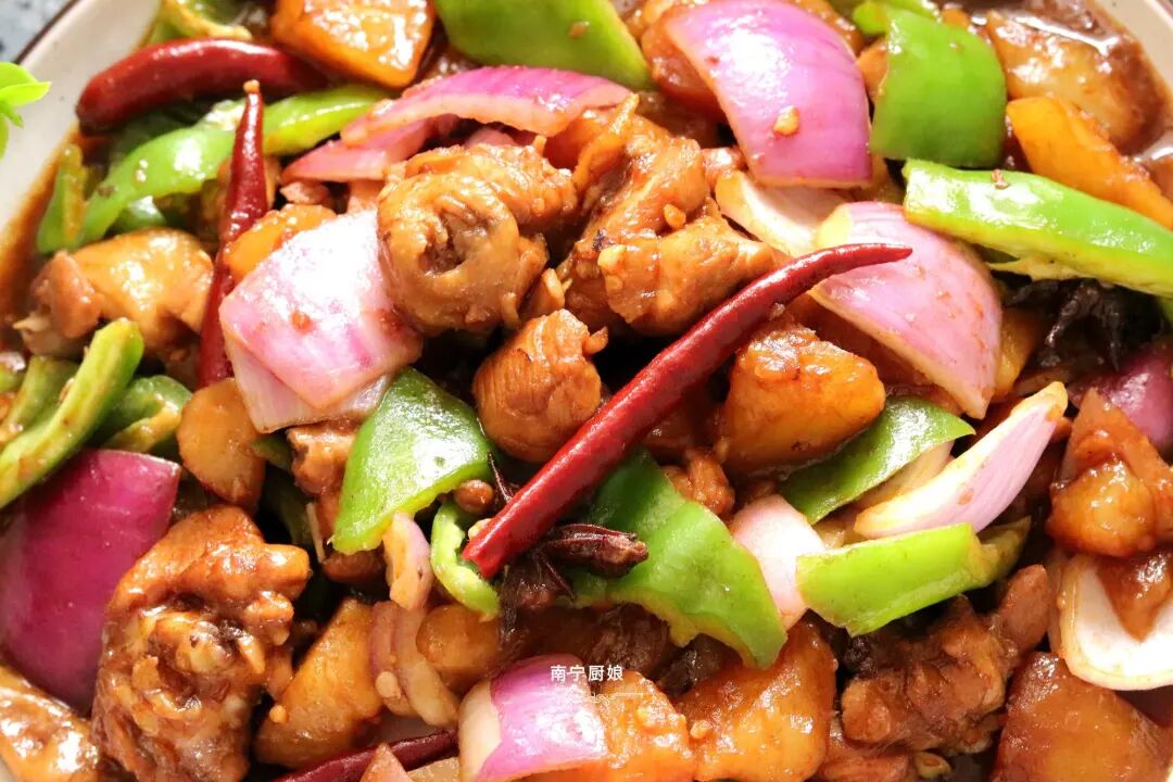 这道新疆大盘鸡是先炒后炖。做好后,吃起来皮焦肉烂,十分的鲜美,盘中鸡肉块还夹杂着青椒和洋葱的鲜艳色彩,看起来十分的有食欲,土豆在炖煮过程中,淀粉充分的混合到了汤汁中,不仅吸收了油腻,还让汤汁更加的粘稠,把汤汁淋在米饭上,都可以干掉2碗米饭呢!