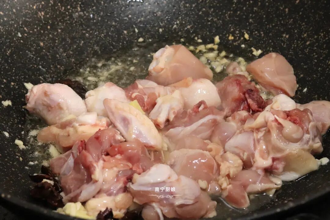 3、起锅,在锅里倒入适量的花生油,小火烧热油后把鸡腿肉倒进去翻炒至表面微黄