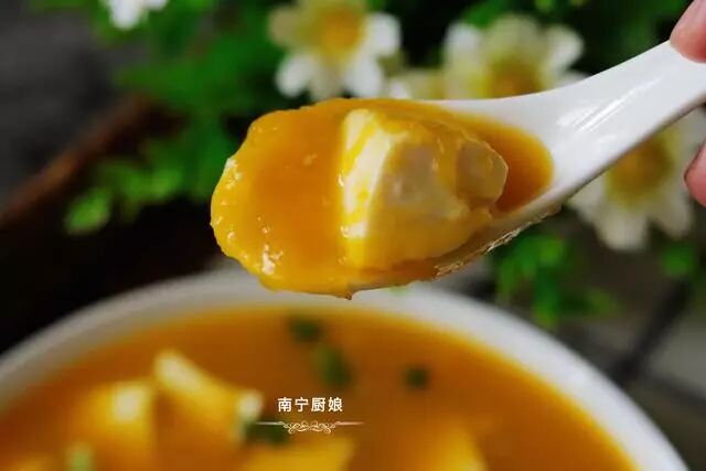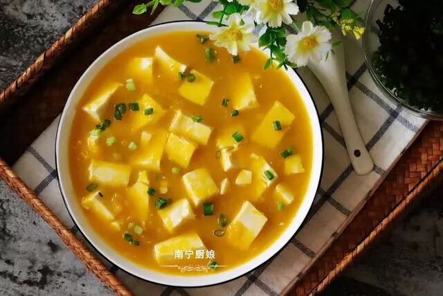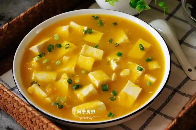 大功告成,出锅装碗,一盘香味浓郁又爽滑的南瓜汤烧豆腐就做好啦!