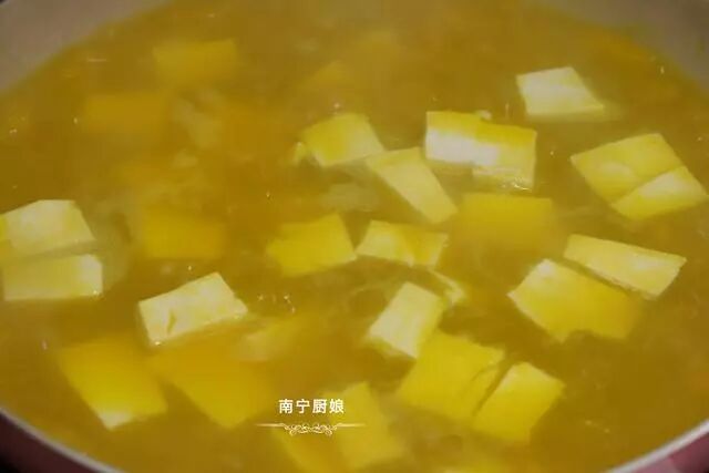 5、把豆腐块倒入锅中和南瓜汤一起继续烧煮至南瓜汤浓稠。