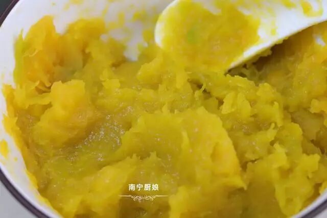 3、南瓜蒸软后,出锅用一个汤勺按压成南瓜泥。