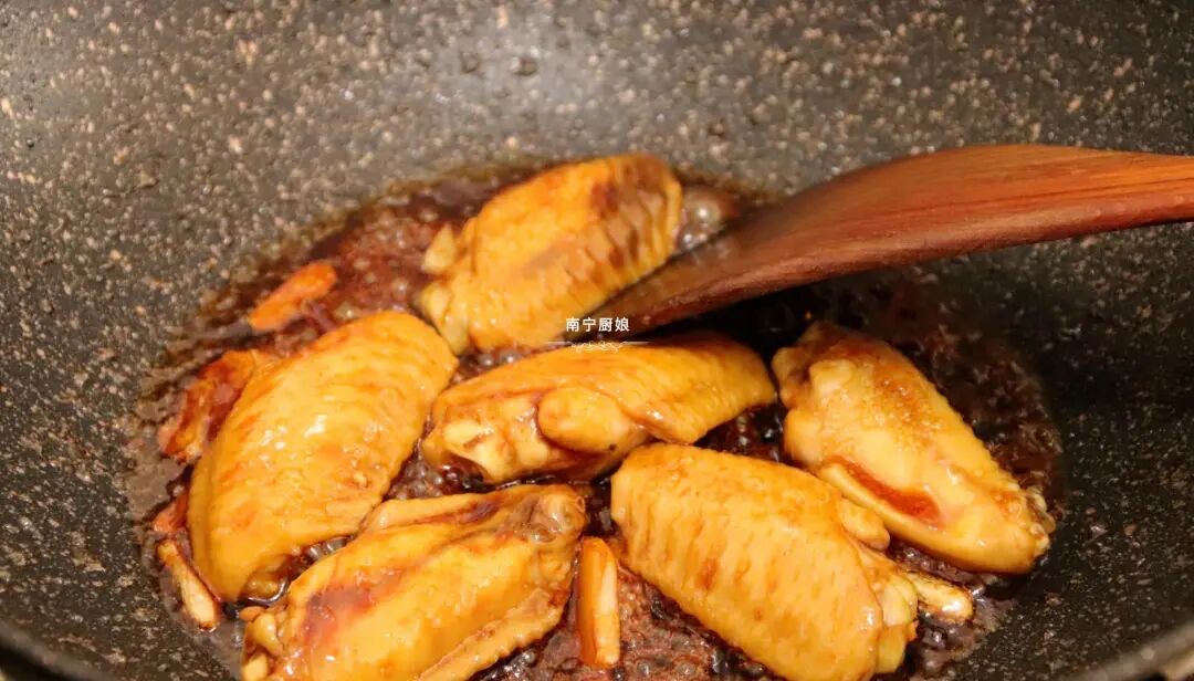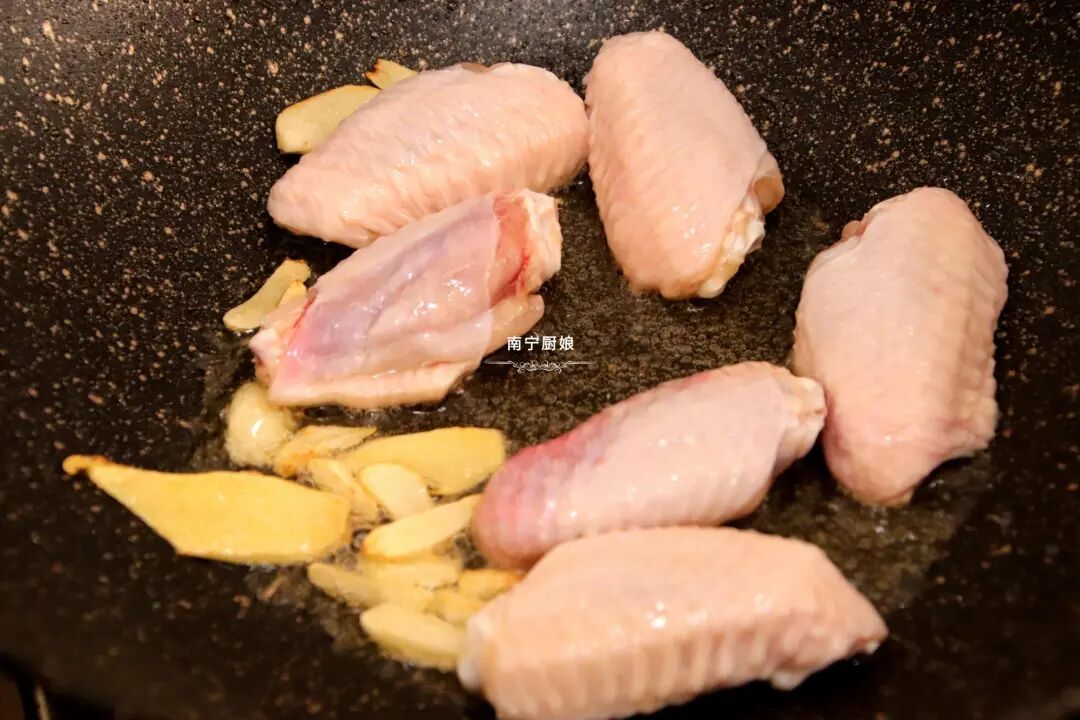 2、把鸡翅洗净后沥干水分再放进去锅里一起煎炒,要不然有水分的时候放进去会溅油烫到自己哦,沿着锅边淋入1勺料酒给鸡翅去腥,料酒在遇热后就会挥发掉,顺便带走鸡腥味,所以不用更担心鸡翅还会有酒味