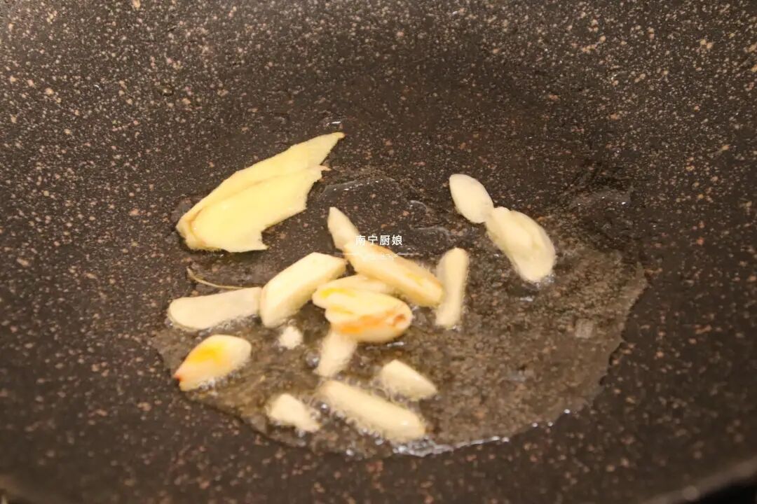 1、把蒜米去皮后切片,生姜切片,在锅里倒入适量的油,小火烧热后把蒜米和生姜倒进去爆香