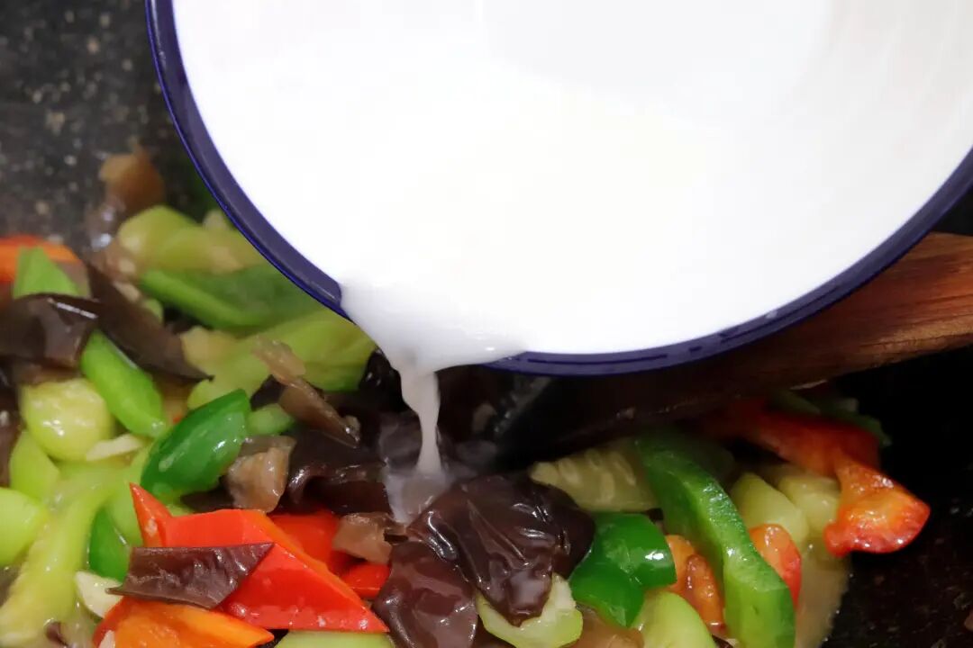 6、倒入水淀粉,让汤汁更粘稠鲜亮,快速翻炒即可出锅