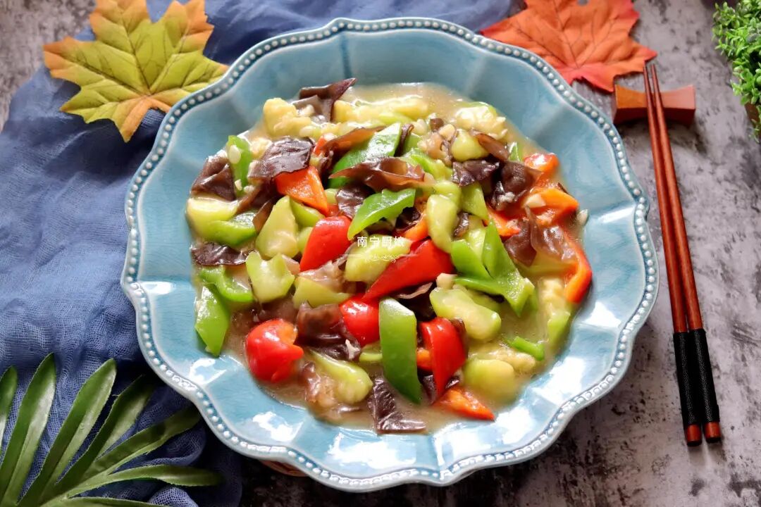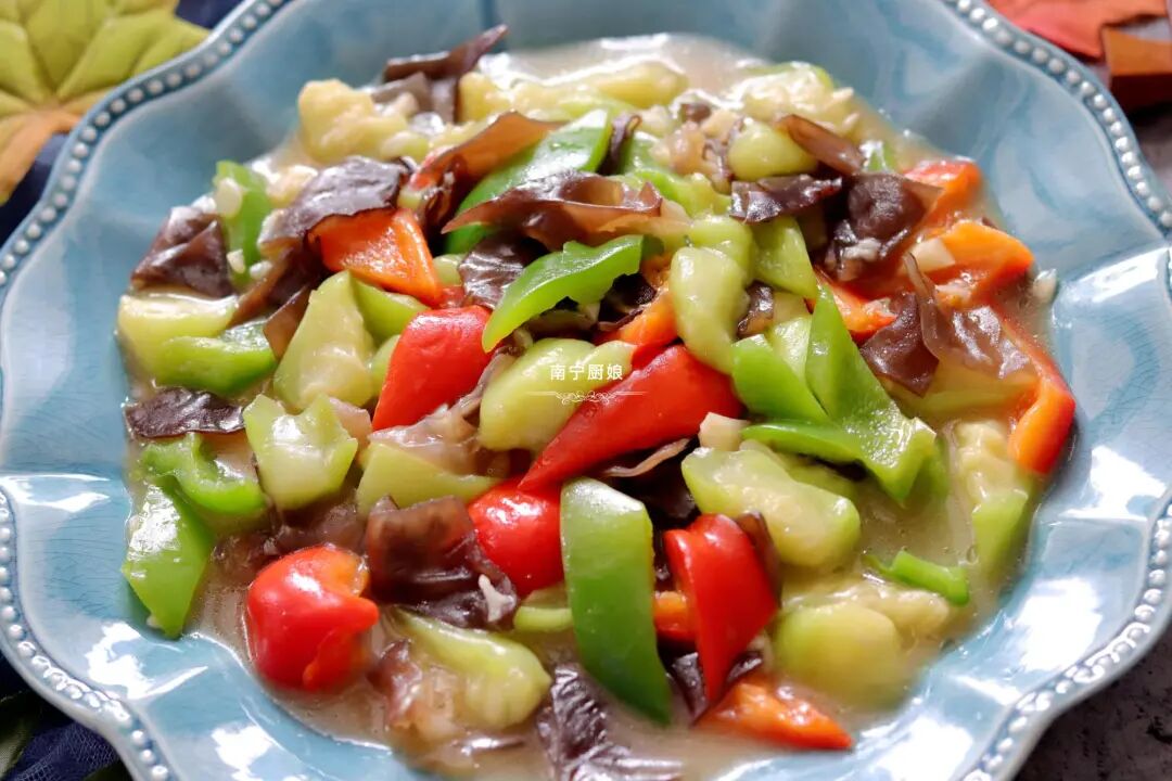 这道蔬食家常菜主要由丝瓜、青红甜椒、木耳一起搭配组成,再配以调料调味,大火快炒就可以做出来一盘色彩丰富,美味又下饭的家常菜了!这道菜第一次做的时候,老公还嫌弃都是素菜,没有一点肉,可当他勉强吃着吃了一口后,直接端起盘子就往碗里开始倒起来,吃到最后,索性把米饭直接盛在盘子里和汤汁一起搅拌着吃,从来没见他吃素菜吃成这样,问他为什么,老公说:真没想到这几种素菜一起搭配烹调,味道太鲜太下饭了,简直比肉还好吃!