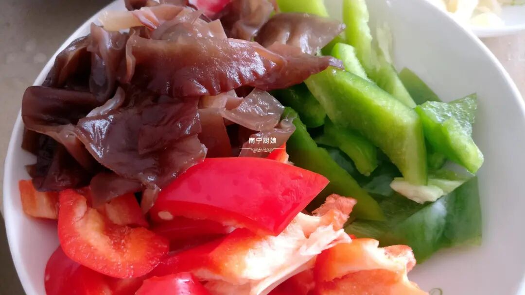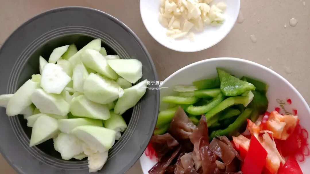 1、把木耳洗净后切成条,红甜椒、青甜椒洗净后切块、丝瓜去皮后切斜刀