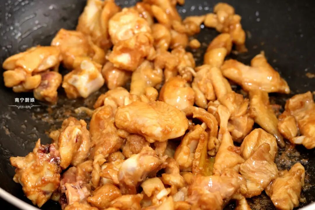 9、把鸡肉块再次倒进去一起翻炒,再淋入另一半料酒,翻炒入味