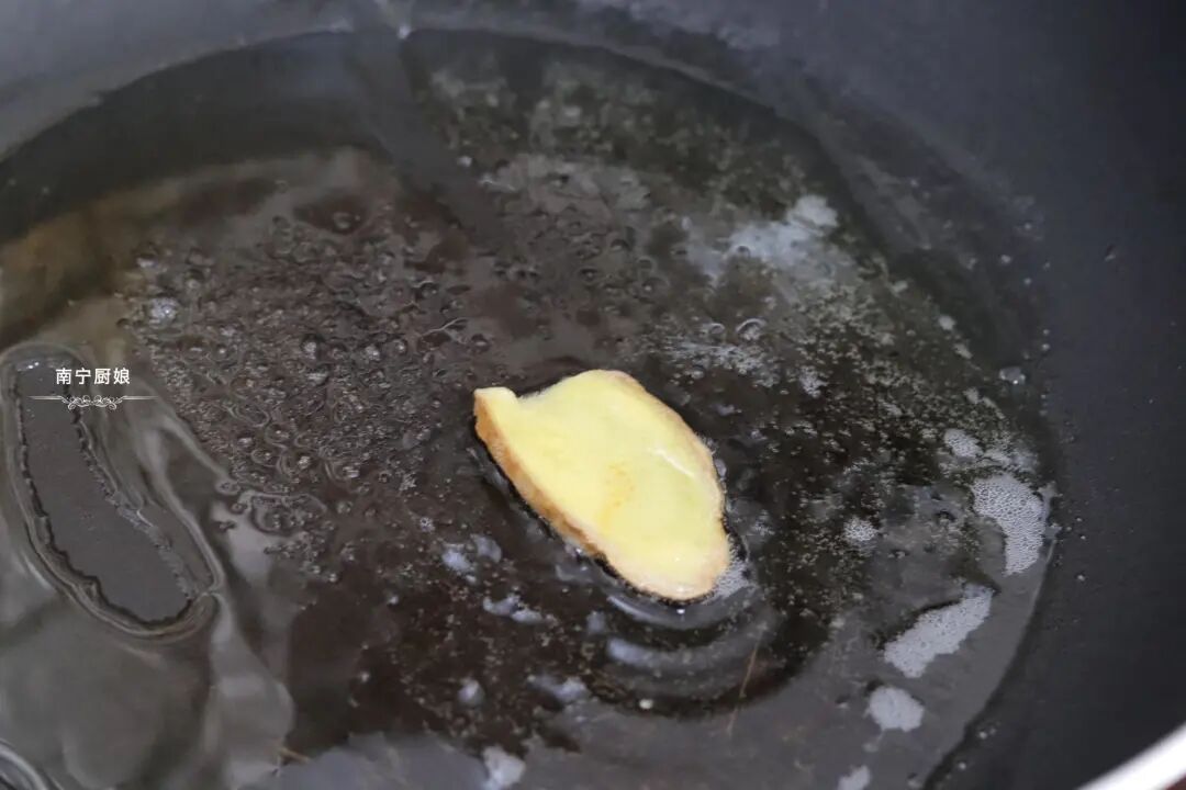 5、在锅里倒入适量的花生油,小火烧热后把生姜片放进去爆香