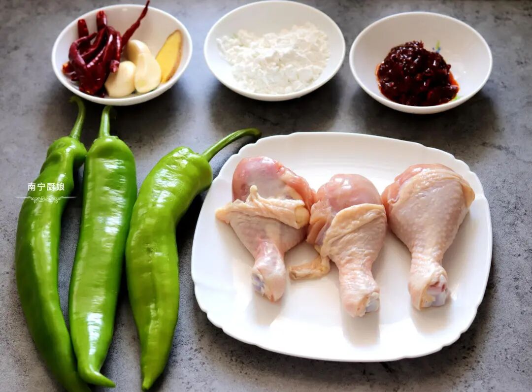 准备好食材:鸡腿3个、青椒3根、干辣椒8颗、花椒20粒、生姜2片、蒜米2粒、葱花1根、豆瓣酱1勺、老抽半勺、生抽1勺、料酒1勺、盐半勺、白砂糖半勺、淀粉半勺