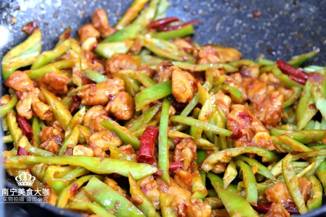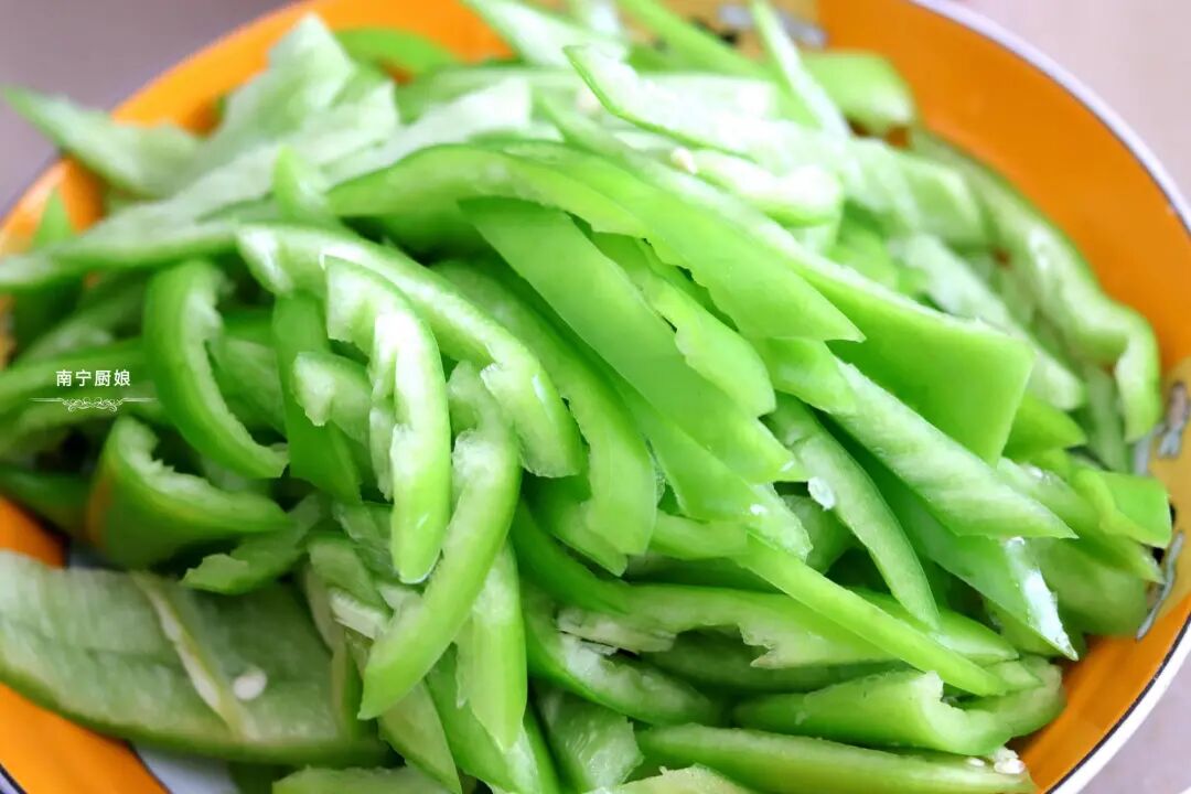 10、再把青椒倒进去一起翻炒熟,再放入合适的盐、糖调味,翻炒均匀即可出锅
