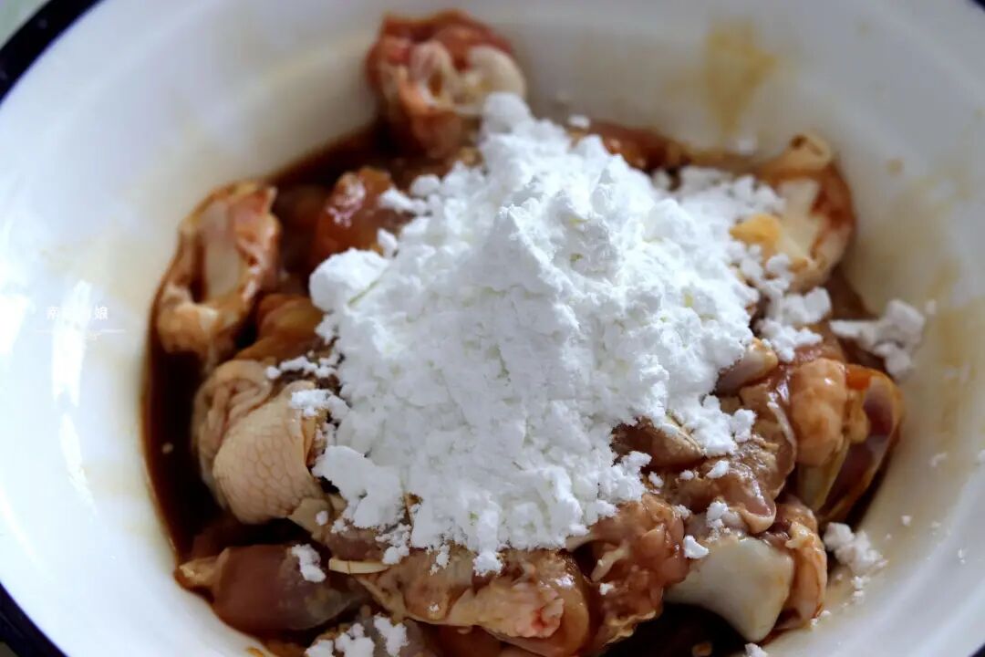 4、在倒入一勺淀粉一起搅拌均匀腌制一个小时