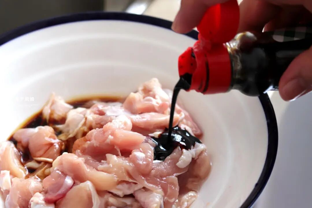 3、在鸡腿肉里倒入半勺老抽、一勺生抽、半勺料酒
