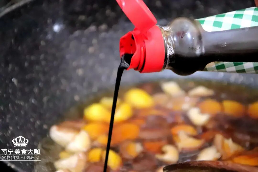 7、水烧开后,倒入1勺生抽、1勺老抽、半勺食盐调味,盖上锅盖焖煮10分钟