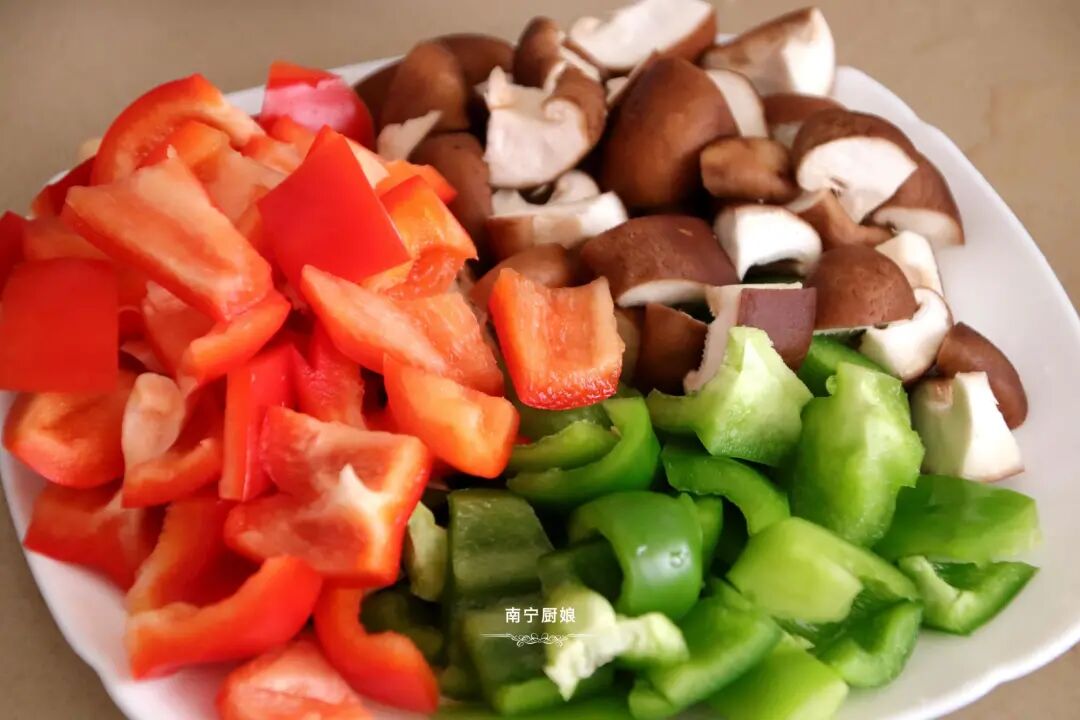 2、趁蒸板栗的空闲,我们把青红椒和香菇洗净后切块装盘待用