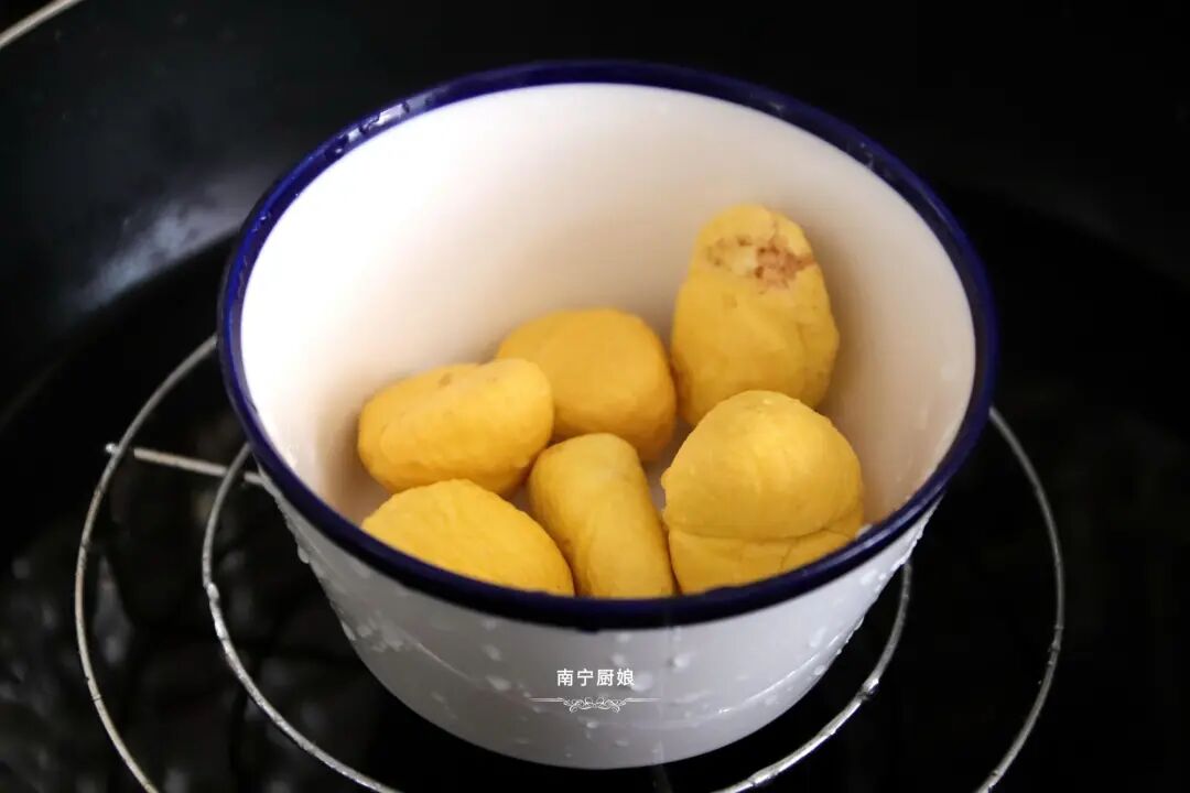 1、因为我买的是剥壳的板栗,所以很方便,不过剥壳的板栗会贵上差不多一倍,大家有时间又想省点钱的还是建议买没剥壳的,把板栗剥壳后放在碗里,隔水蒸上10分钟左右蒸熟后待用