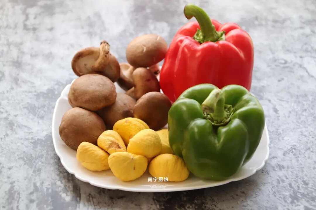 准备好食材:板栗300克、青红椒各一个、香菇200克、生抽1勺、老抽1勺、生姜2片、食盐半勺