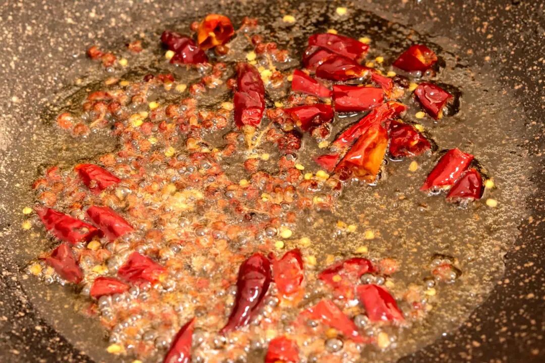 5、留上一些底油继续用,把干辣椒和花椒倒进去爆香(如果之前炒鸡块有些残留,一定要铲除干净,要不然继续和干辣椒炒,就会炒糊锅了)