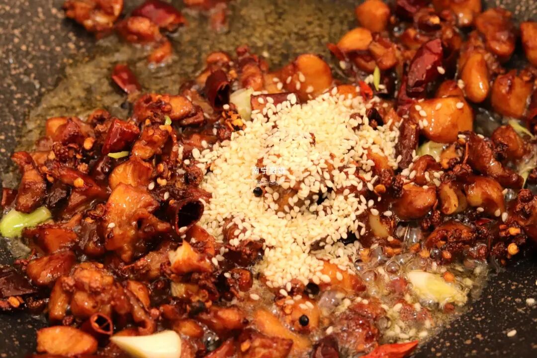 8、炒至鸡肉表面酥脆后,放入白芝麻关火,利用余热把白芝麻和鸡肉翻炒均匀