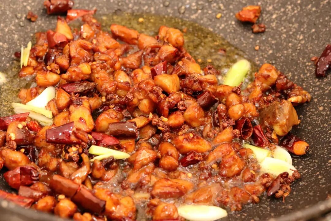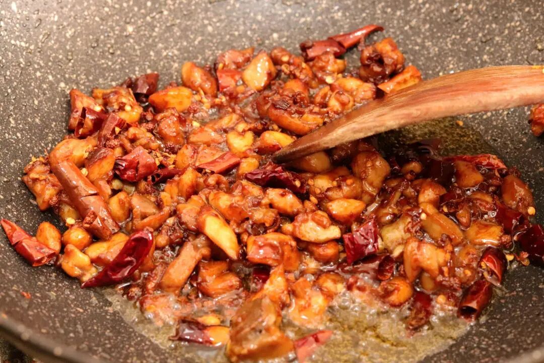 3、建议把油烧热后大火炸,热量快速让鸡肉表面酥脆起来,而锁住了鸡肉里面的水分,让里面的鸡肉吃起来很鲜嫩,辣子鸡