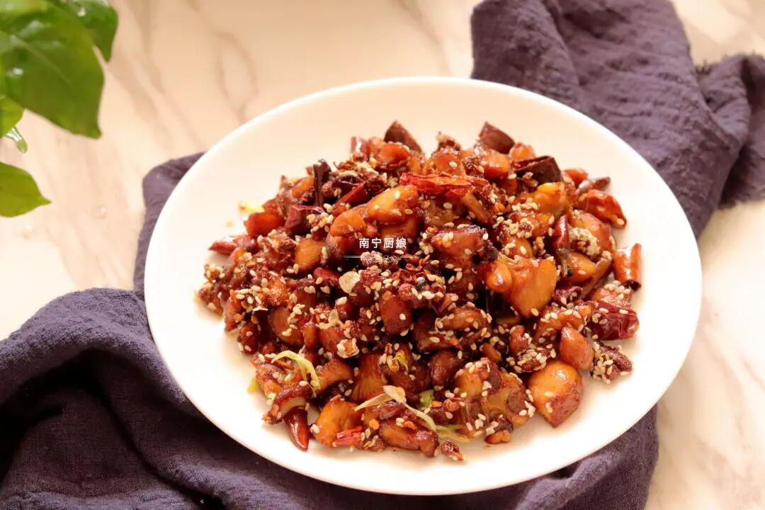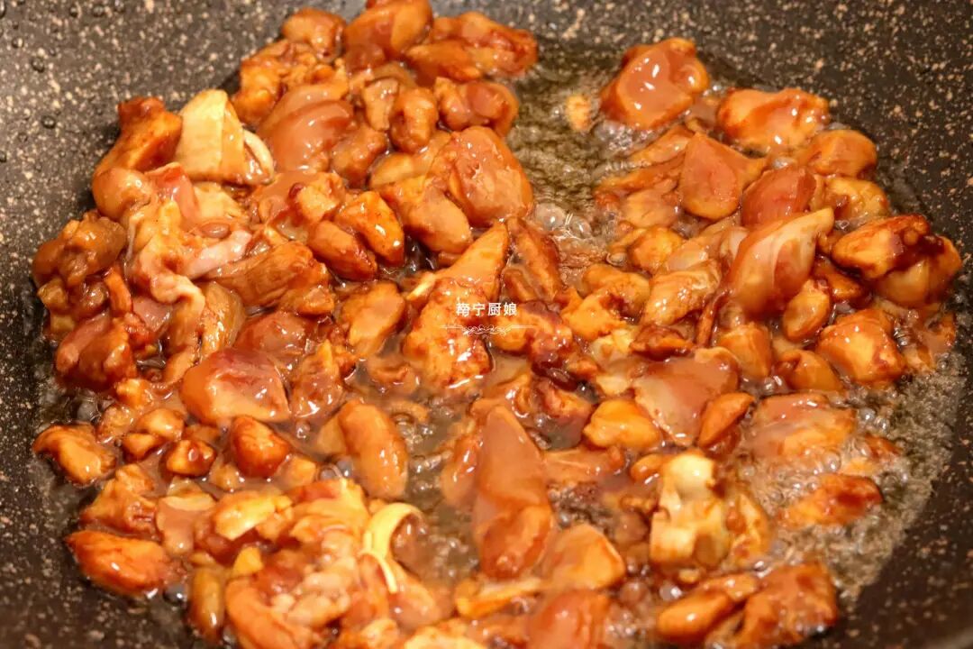 2、还有就是在正式下锅炒至之前,也请发狂的多撒点盐来腌制入味,要不然鸡肉在炒至的时候,鸡肉已经被炸干了,鸡肉组织已经变得很紧实了,你再放盐是很难入味的哈!
