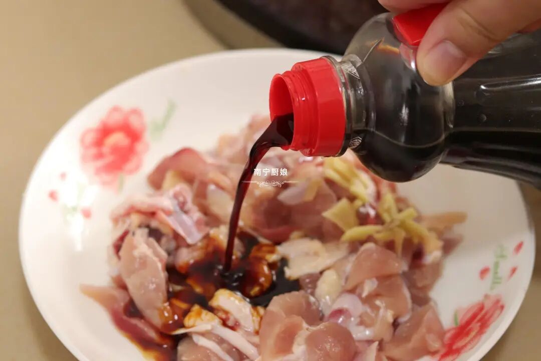 3、在鸡腿肉里放入生姜丝、倒入1勺生抽、1勺老抽、1勺食盐、1勺白砂糖、1勺生粉、1勺清水搅拌均匀腌制30分钟