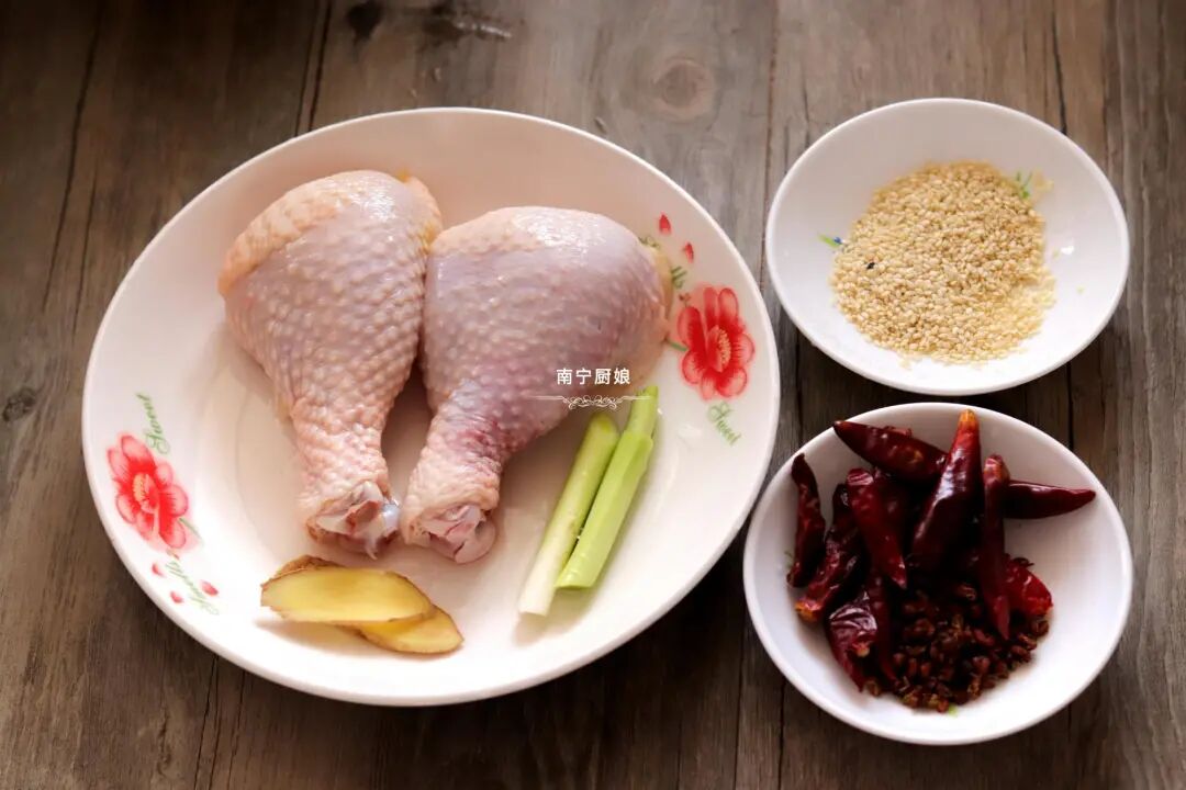 准备好食材:鸡腿1个、生姜2片、青蒜2段、白芝麻100克、干辣椒10克
