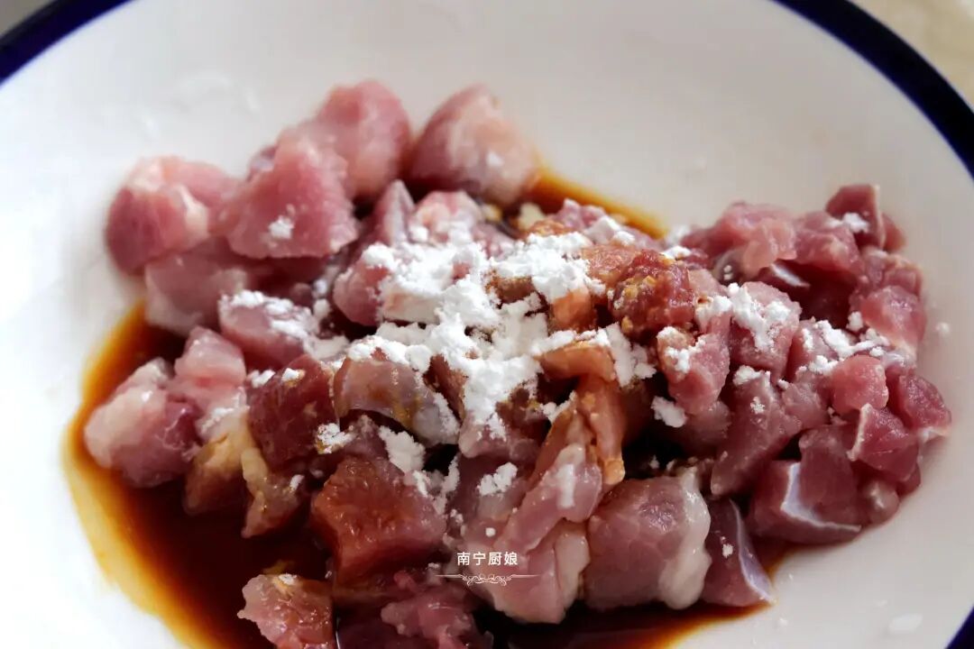 1、把里脊肉洗净后切成小块,大家在切里脊肉的时候,一定要先去除连在肉上面的筋和膜,否则不但不好切,吃起来口感也不好,而且要斜切才会肉质完整,而且吃起来也不会塞牙,切好后把肉丁放在碗里,倒入1勺味极鲜、半勺老抽、半勺淀粉把肉腌制10分钟