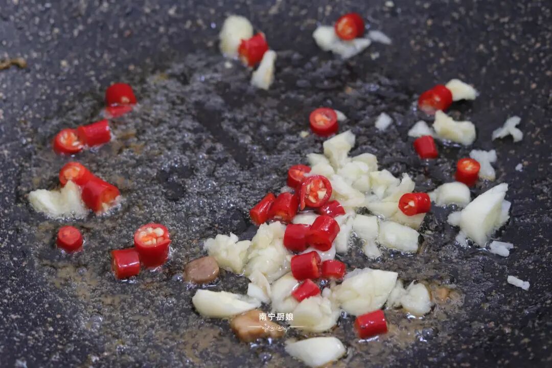 4、重新起锅,在锅里倒入适量的花生油,小火烧热后倒入切成段的小红椒和蒜米爆香