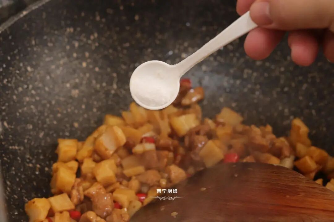 7、放入一勺食盐,翻炒均匀即可出锅啦!