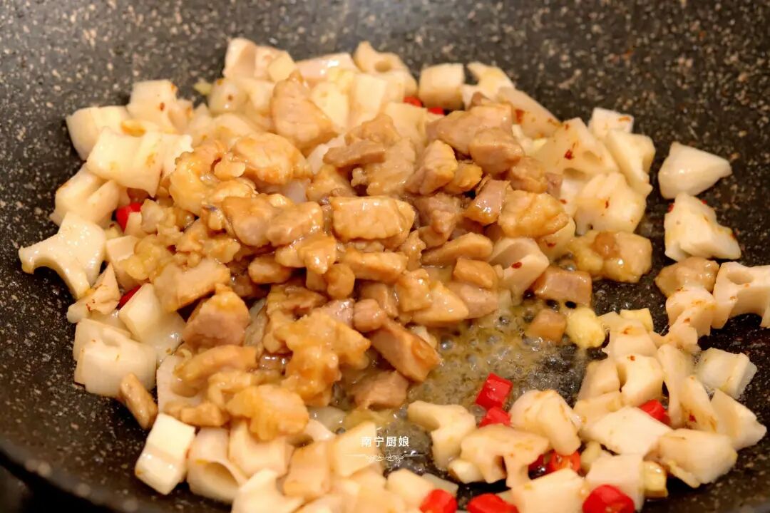 6、倒入1勺味极鲜给莲藕调味上色,把之前炒好的肉块也倒进去一起翻炒均匀均匀