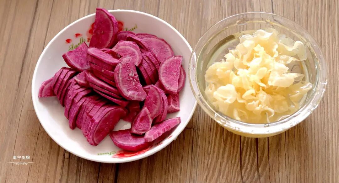 今天做的这道紫薯银耳羹主要材料就是紫薯和银耳,把紫薯蒸熟后剥皮压成泥,再把银耳泡发后切成小朵,然后一起炖煮,让银耳的胶质充分的融化,使其和紫薯充分一起融合,煮好后再放入冰箱里冷藏2个小时再拿出来喝,清凉爽滑又香甜,真是好喝极了!接下来我们就一起来看下详细做法吧!