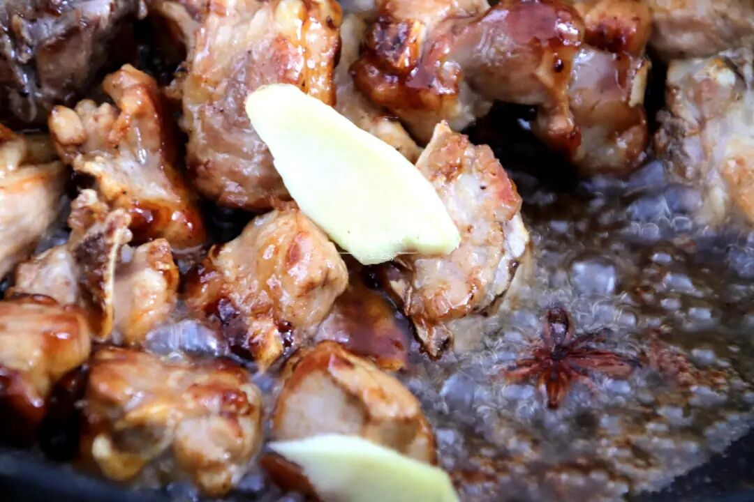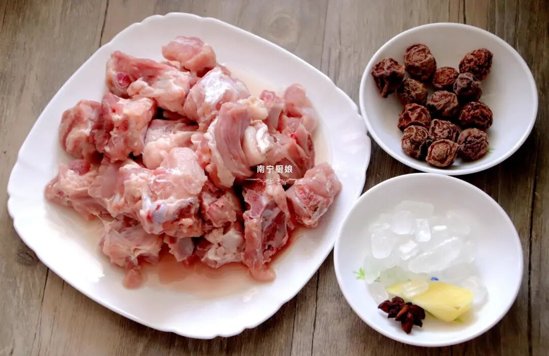 准备好食材:猪排骨500克、冰糖20克、生姜2片、话梅10克、八角1颗、味极鲜2勺