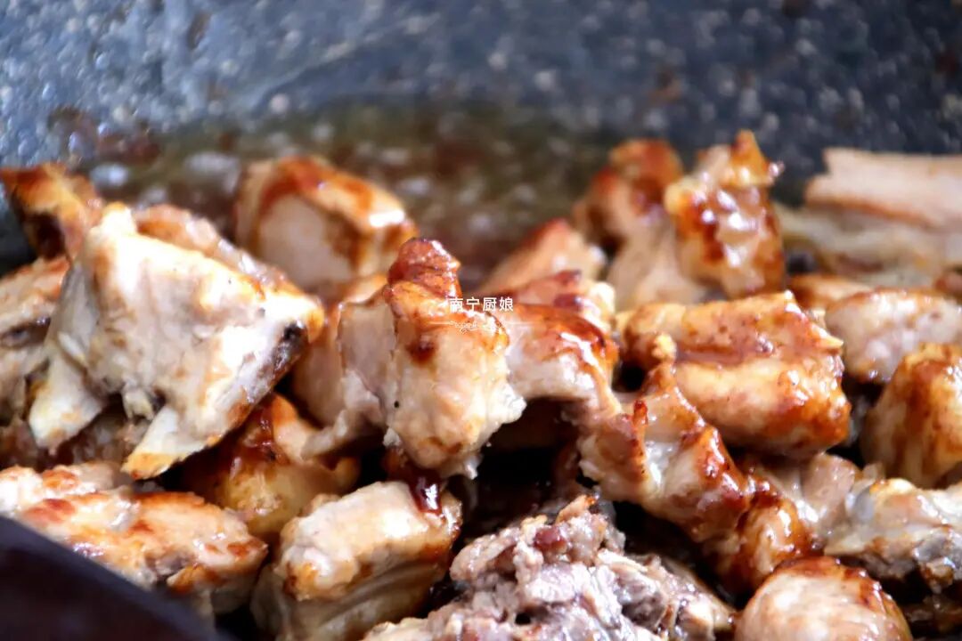 4、把排骨倒进去继续翻炒,让排骨裹上糖色