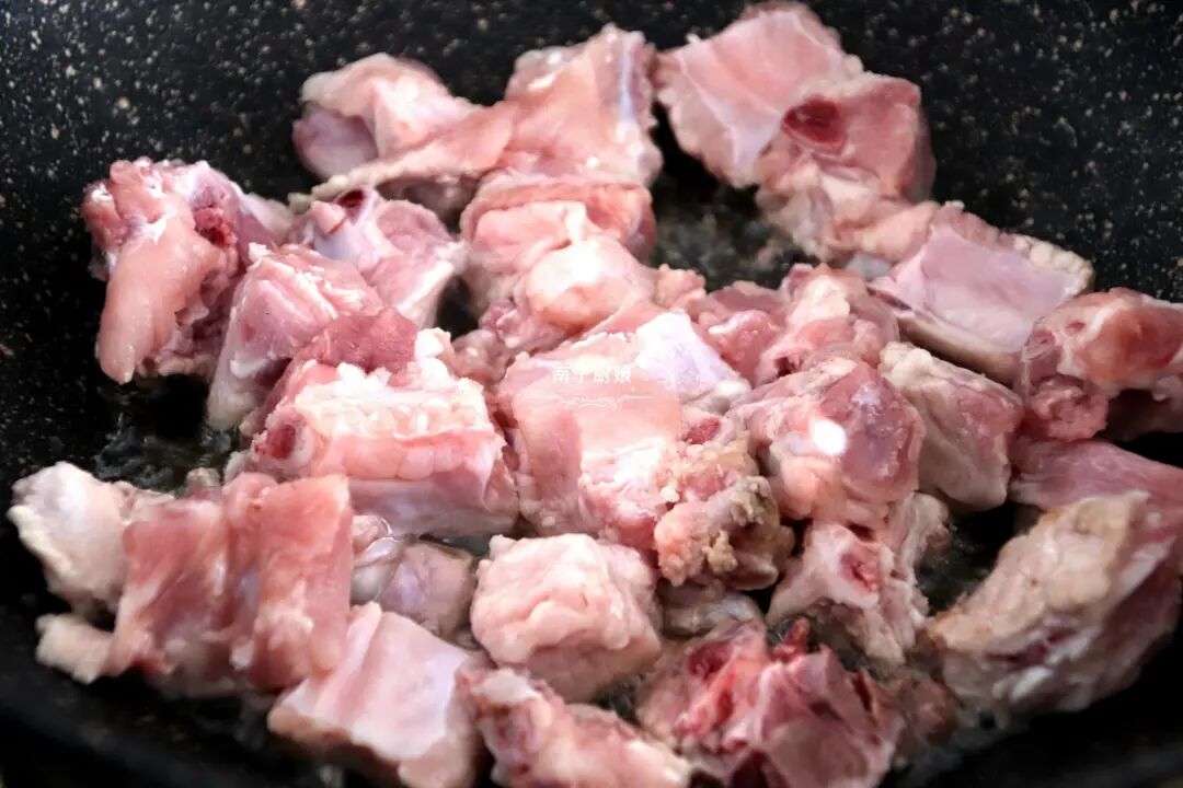 2、锅里倒入适量的花生油,小火烧热后把排骨倒进去煎炒至表面焦黄