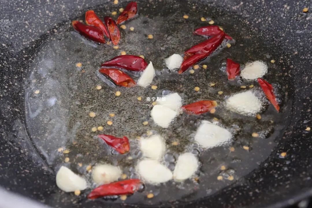 4、起锅,在锅里倒入适量的花生油小火烧热,把干辣椒和蒜米倒入爆香