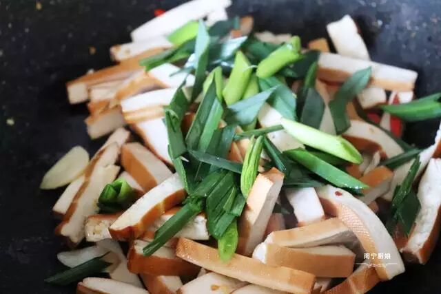 4、先把焯水沥干水分的豆干倒入锅中翻炒均匀均匀,再把青蒜叶也倒入一起翻炒出香气。