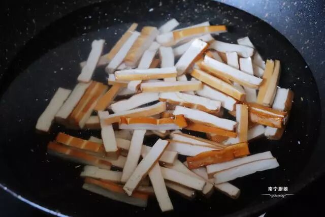 2、在锅里烧热半锅水,把豆干倒入焯水1分钟后捞出沥干水分装盘待用。