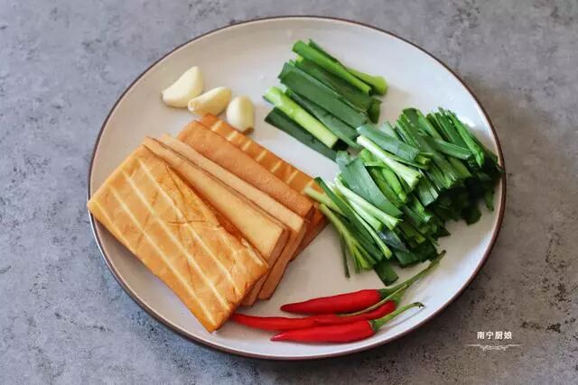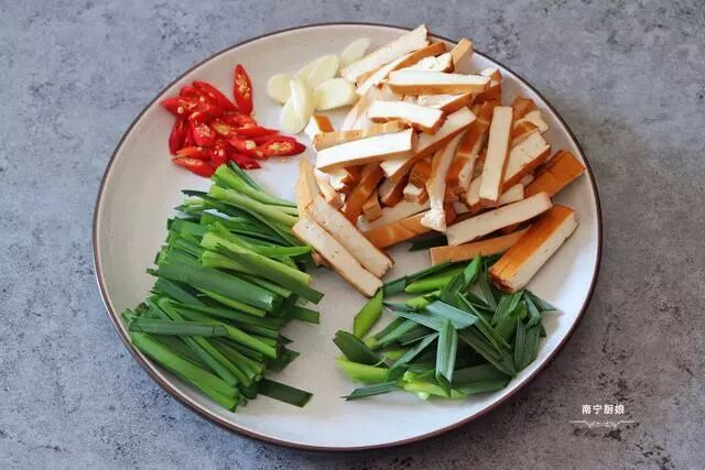 1、把豆干切成条,韭菜和青蒜叶切段,指天椒洗净切斜段,大蒜切成片装盘待用。