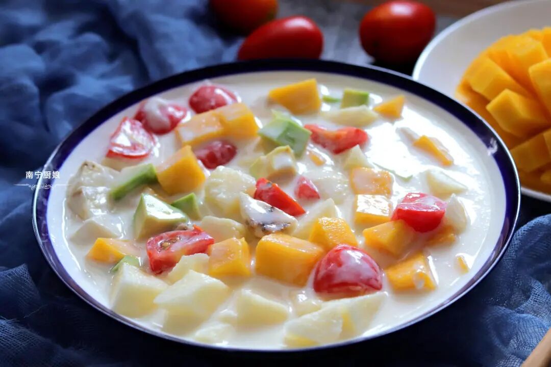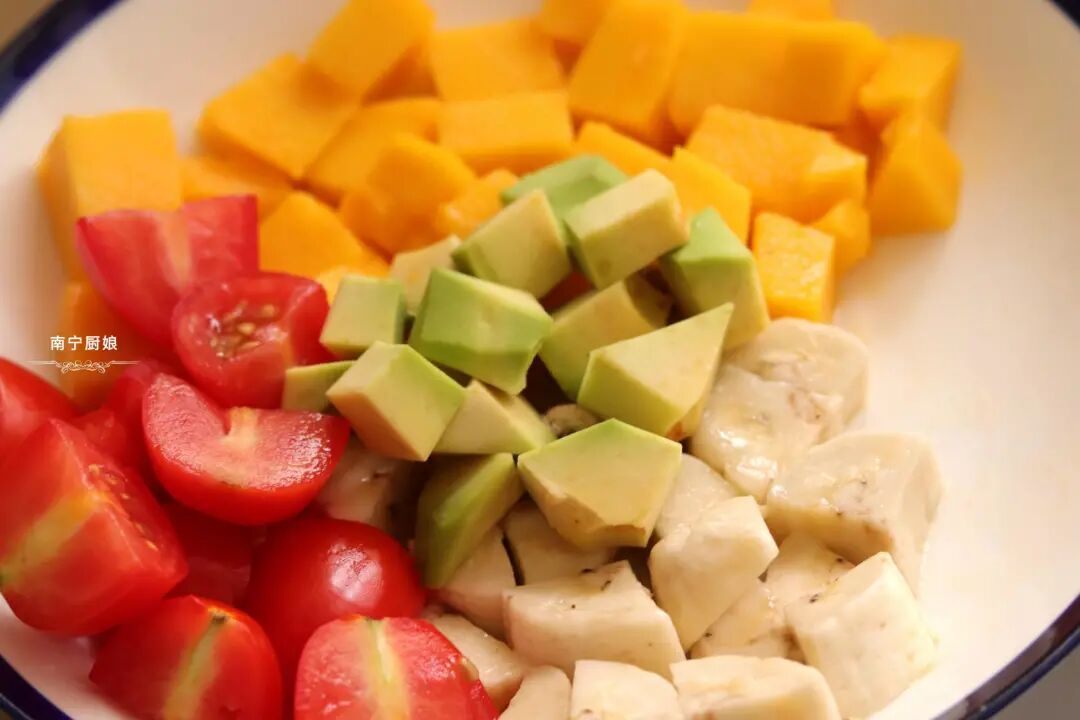 今天和大家分享的这道水果沙拉食材主要有:芒果1个、牛油果1个、苹果1个、小番茄6个、酸奶1杯、芭蕉1根、柠檬1片,其中芒果是著名热带水果,富含蛋白质、维生素A、维生素C、胡萝卜素、粗纤维等;牛油果是一种营养价值很高的水果,具有森林奶油”的美誉,富含含多种维生素、丰富的脂肪酸和蛋白质和高含量的钠、钾、镁、钙等元素。苹果是美容佳品,既能减肥,又可使皮肤润滑柔嫩。苹果是种低热量食物,富含维生素、铜、碘、锰、锌、 钾等元素;小番茄也叫圣女果,富含维生素,具有生津止渴、健胃消食、清热解毒、凉血平肝,补血养血和增进食欲的功效。芭蕉香蕉的营养价值差不多,都有润肠通便功效。而酸奶富含蛋白质、钙质、乳酸菌,具有促进食欲、补钙等作用。