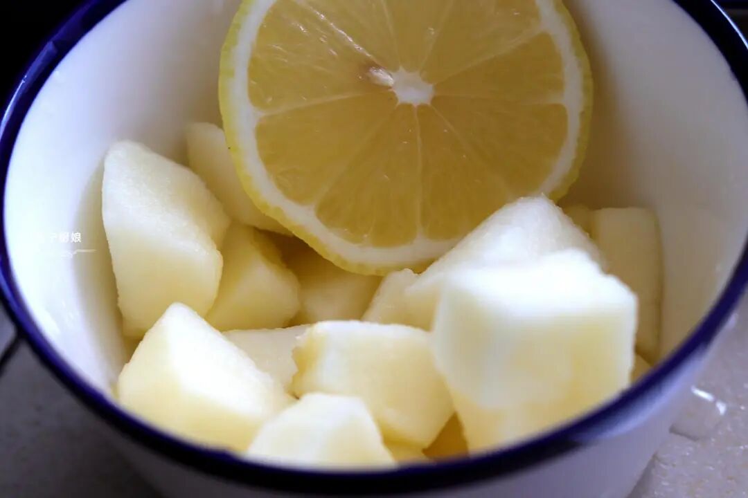 1、把苹果去皮后切成小块,然后切一片柠檬把柠檬汁挤在苹果块上搅拌均匀,这样做的目的是因为苹果大家都知道,一旦去皮接触空气太久就会发黑,让苹果裹上柠檬汁后,可以很好的隔绝空气,防止苹果变黑