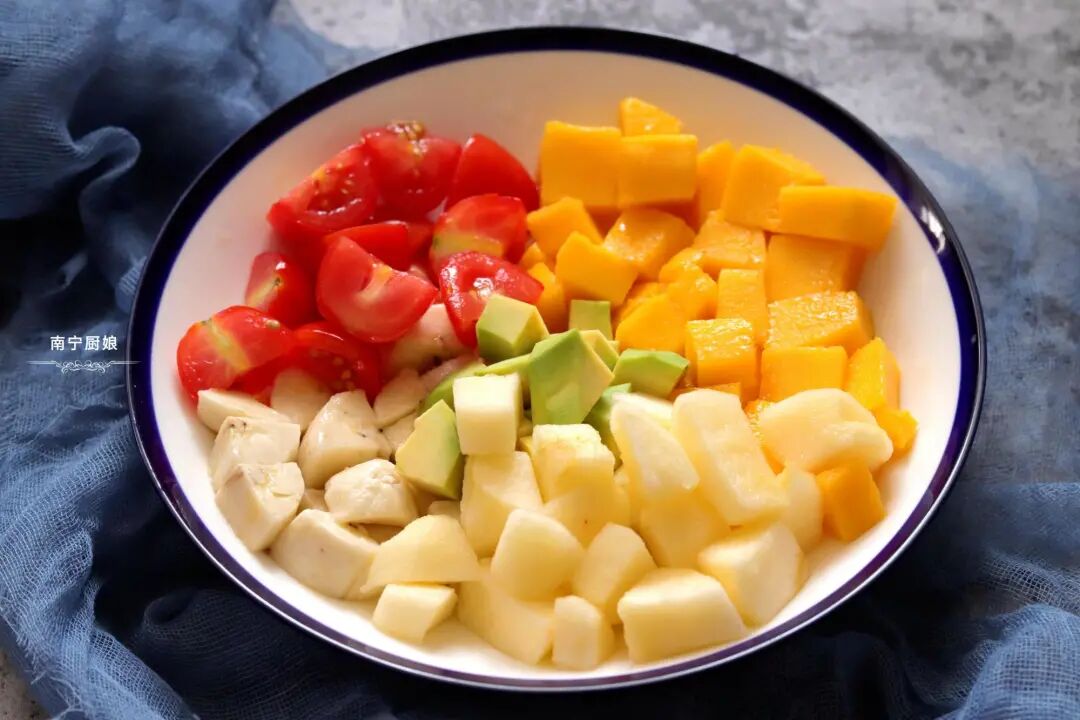 2、接着把小番茄洗净后切小块、牛油果起皮后切小块、芒果起皮后切块、芭蕉去皮后切小块