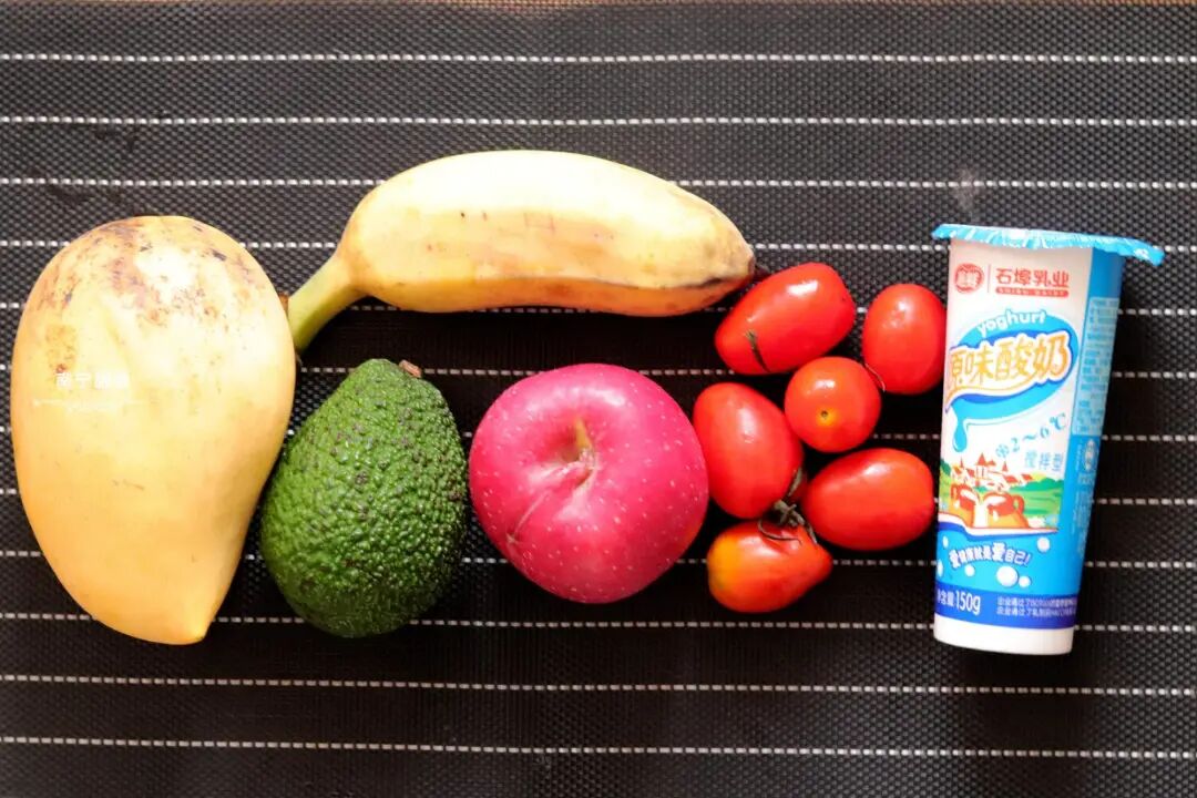 准备好食材:芒果1个、牛油果1个、苹果1个、小番茄6个、酸奶1杯、芭蕉1根、柠檬1片