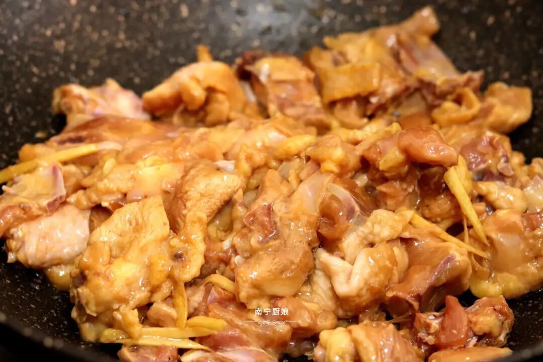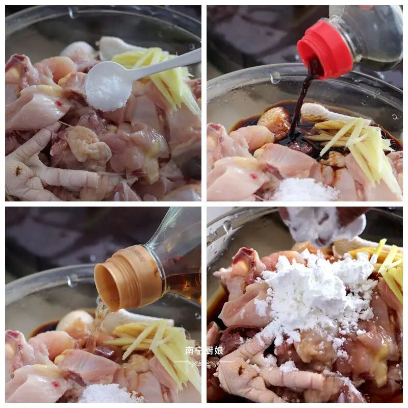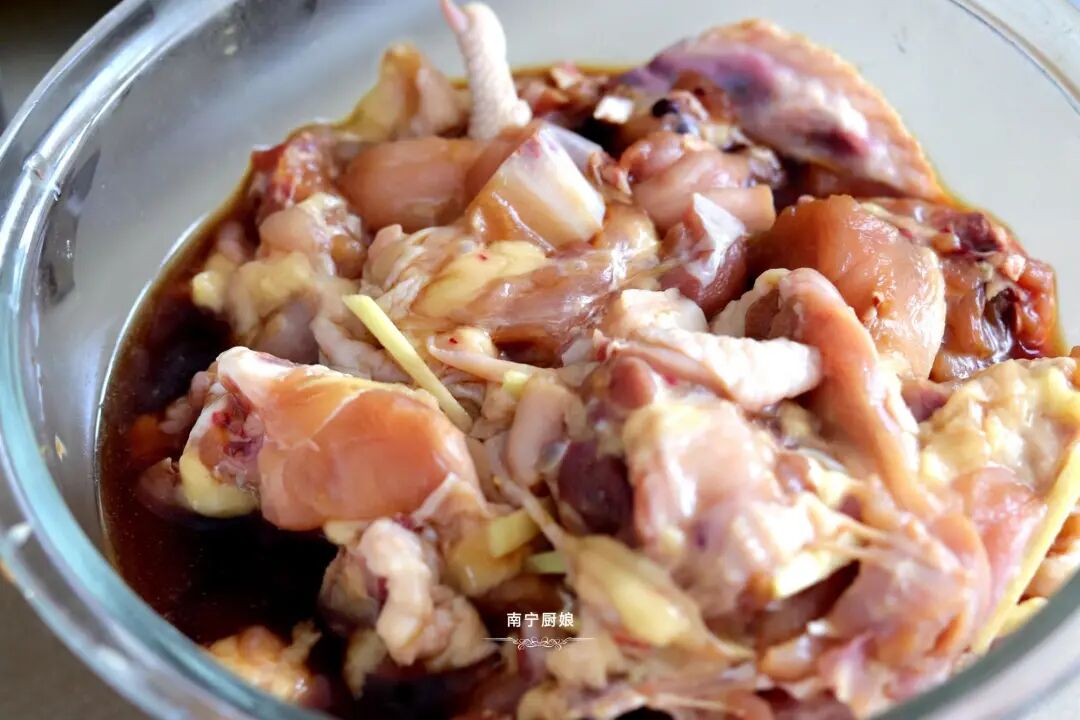 1、鸡肉砍成块后洗净装碗,放入一勺食盐、一勺生抽、姜丝、料酒1勺、淀粉1勺、食用油1勺