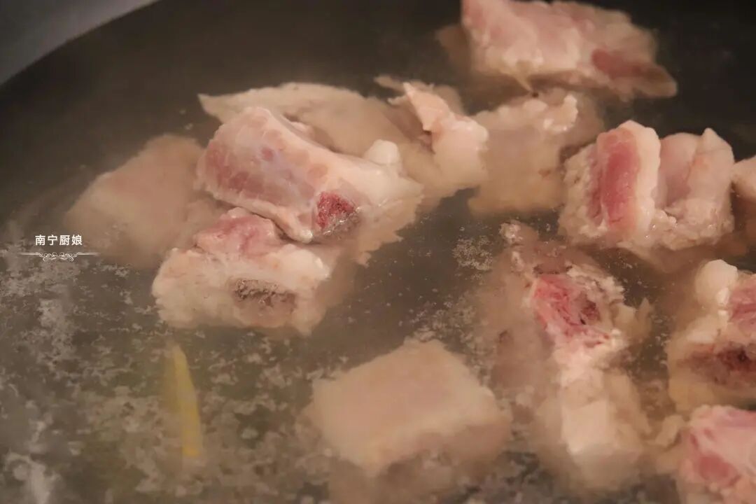 1、把排骨洗干净后放在锅里,倒入没过排骨的清水,再放入2片生姜,倒入1勺料酒