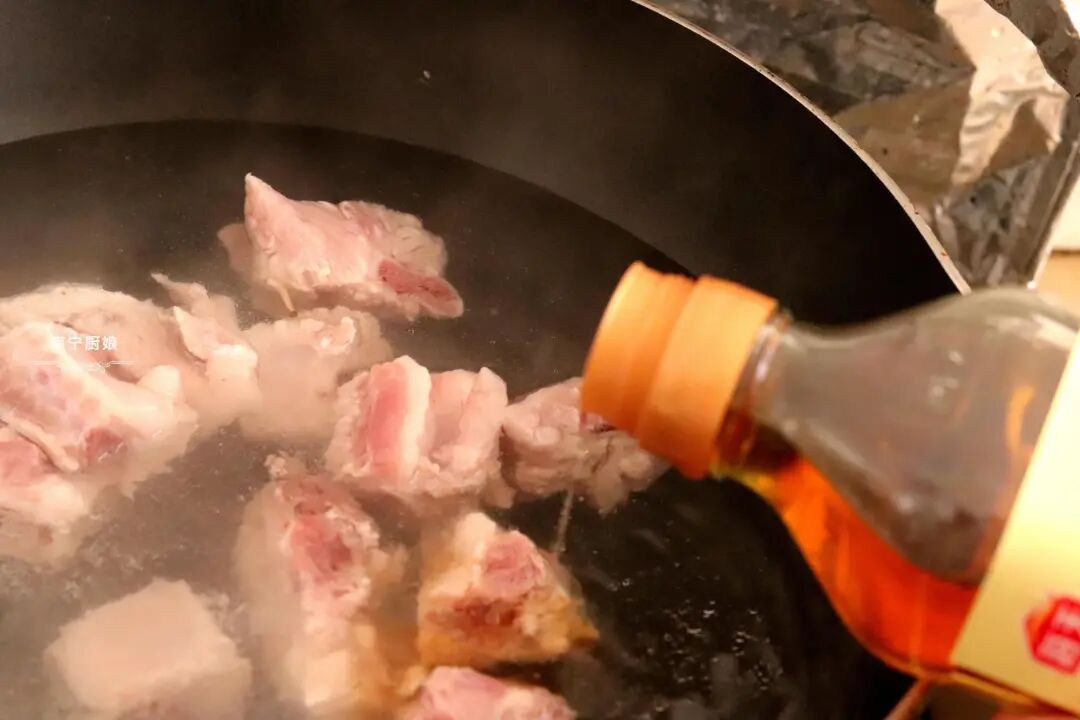 3、排骨焯水后在水龙头下冲洗掉浮沫沥干装进锅里