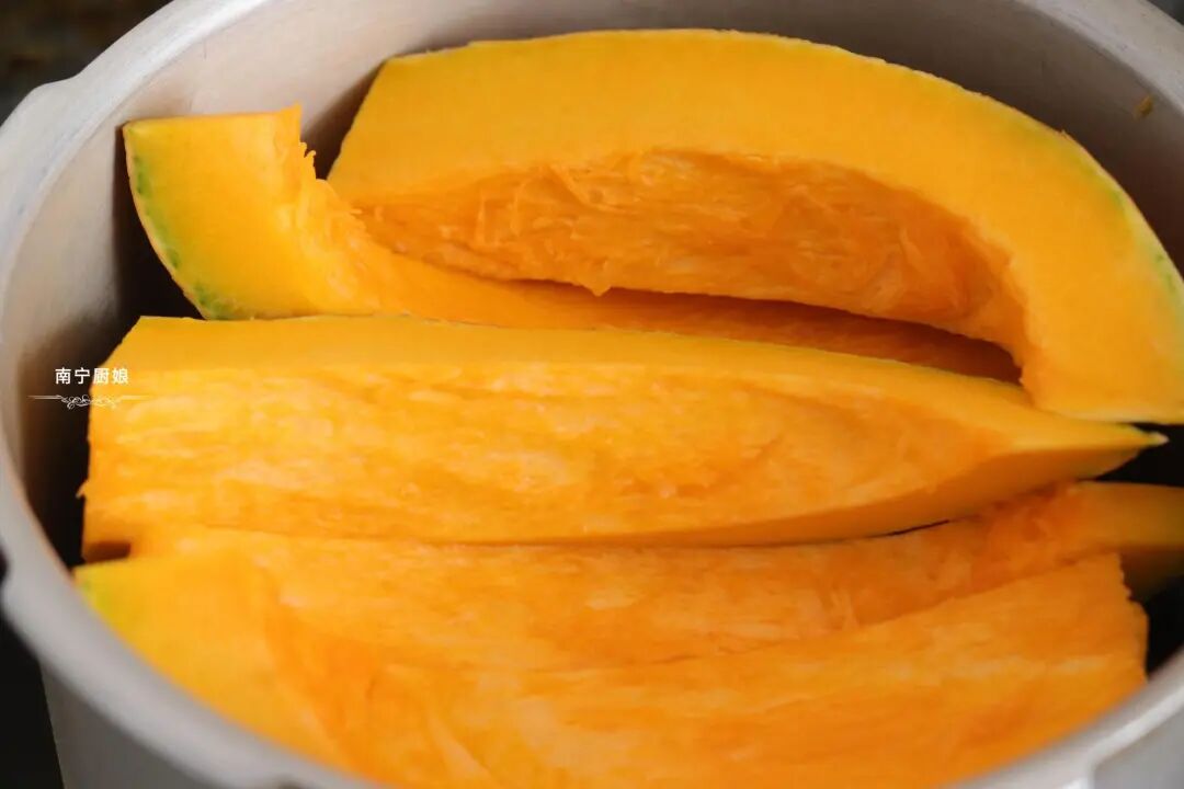 4、南瓜也可以直接切成南瓜片或南瓜块放到粥中煮,如果这样就要跟小米一同下锅。