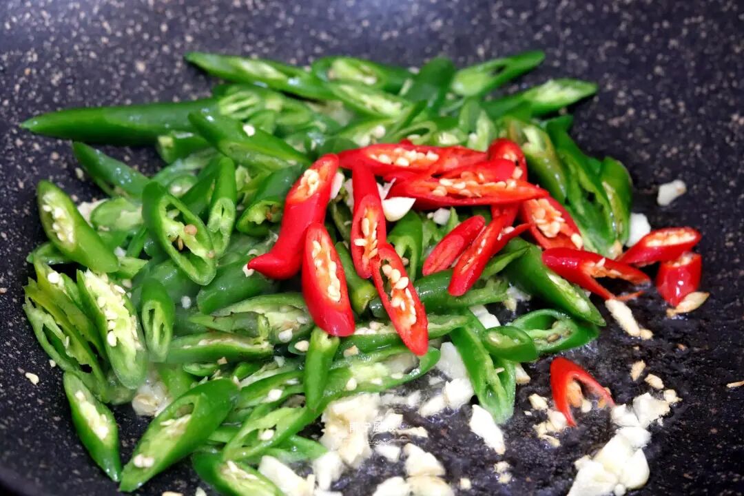 6、把线椒和小红椒也倒进去一起调大火翻炒出辣椒香味